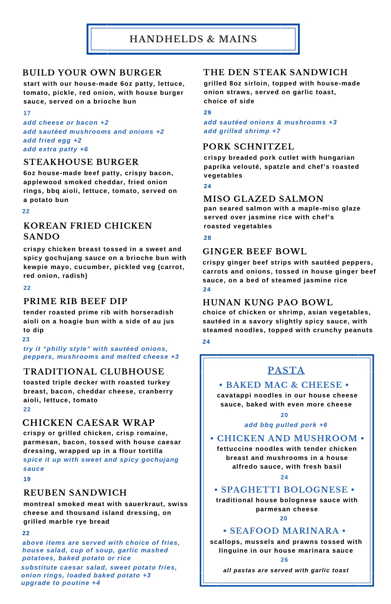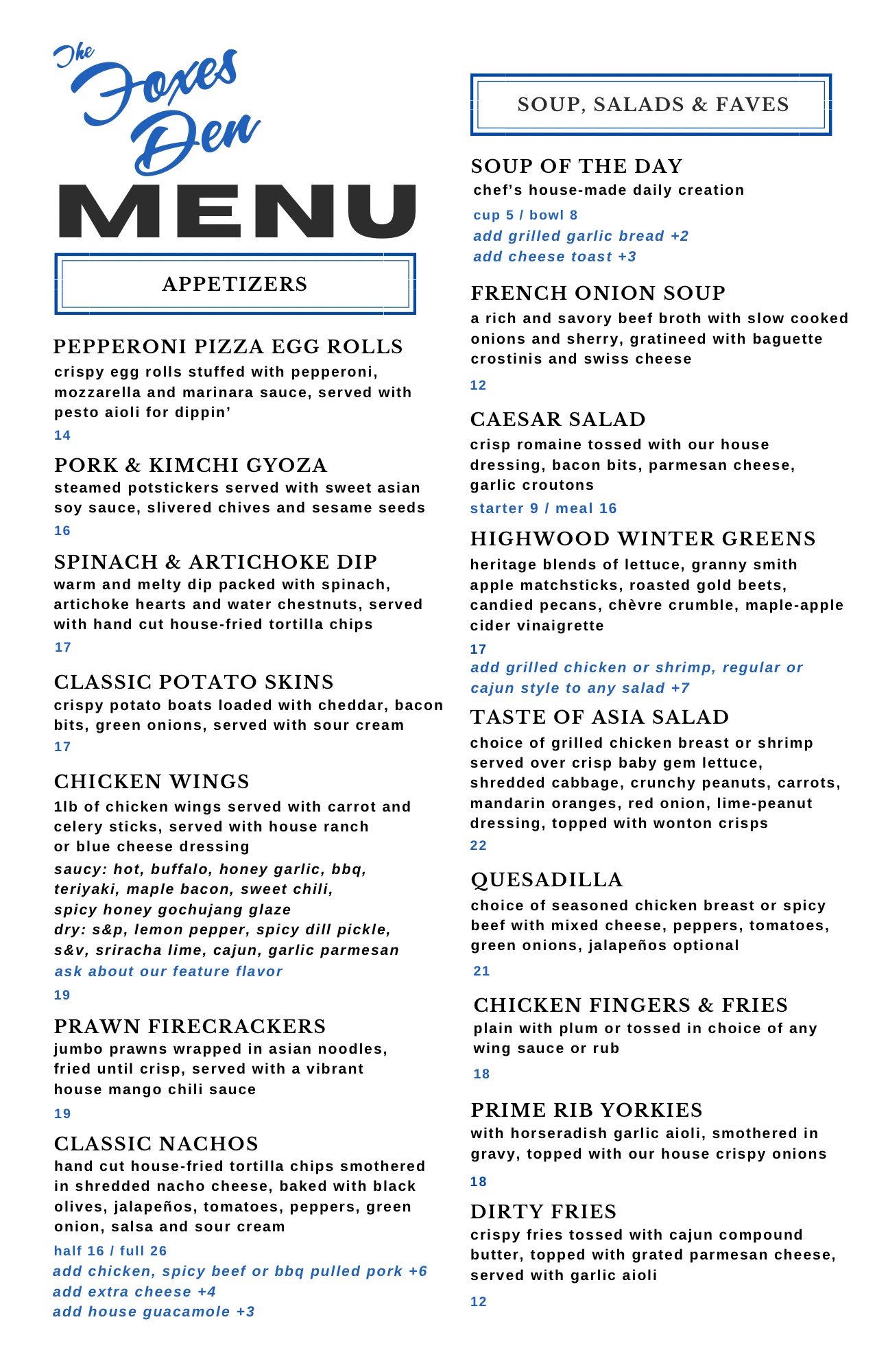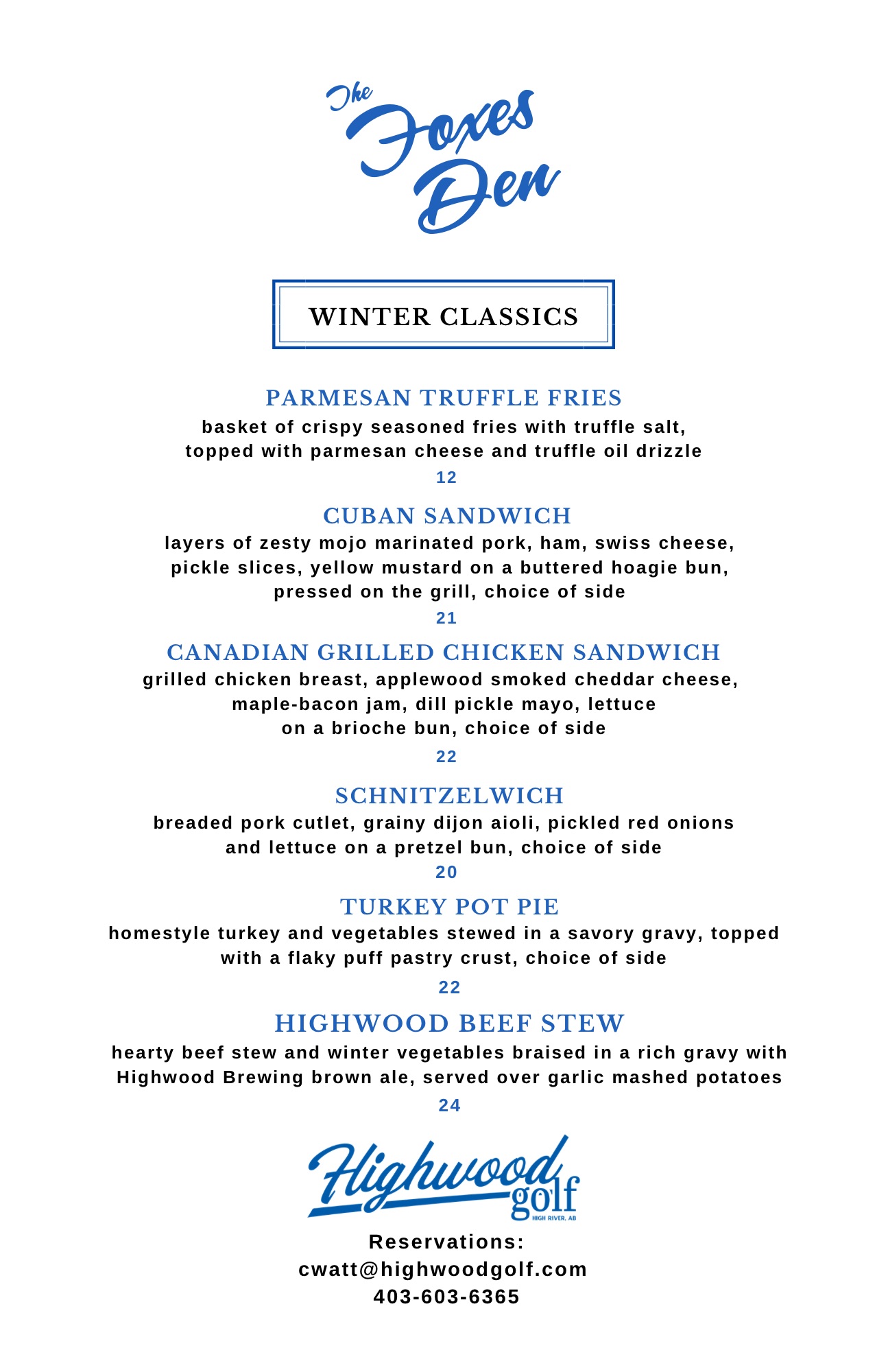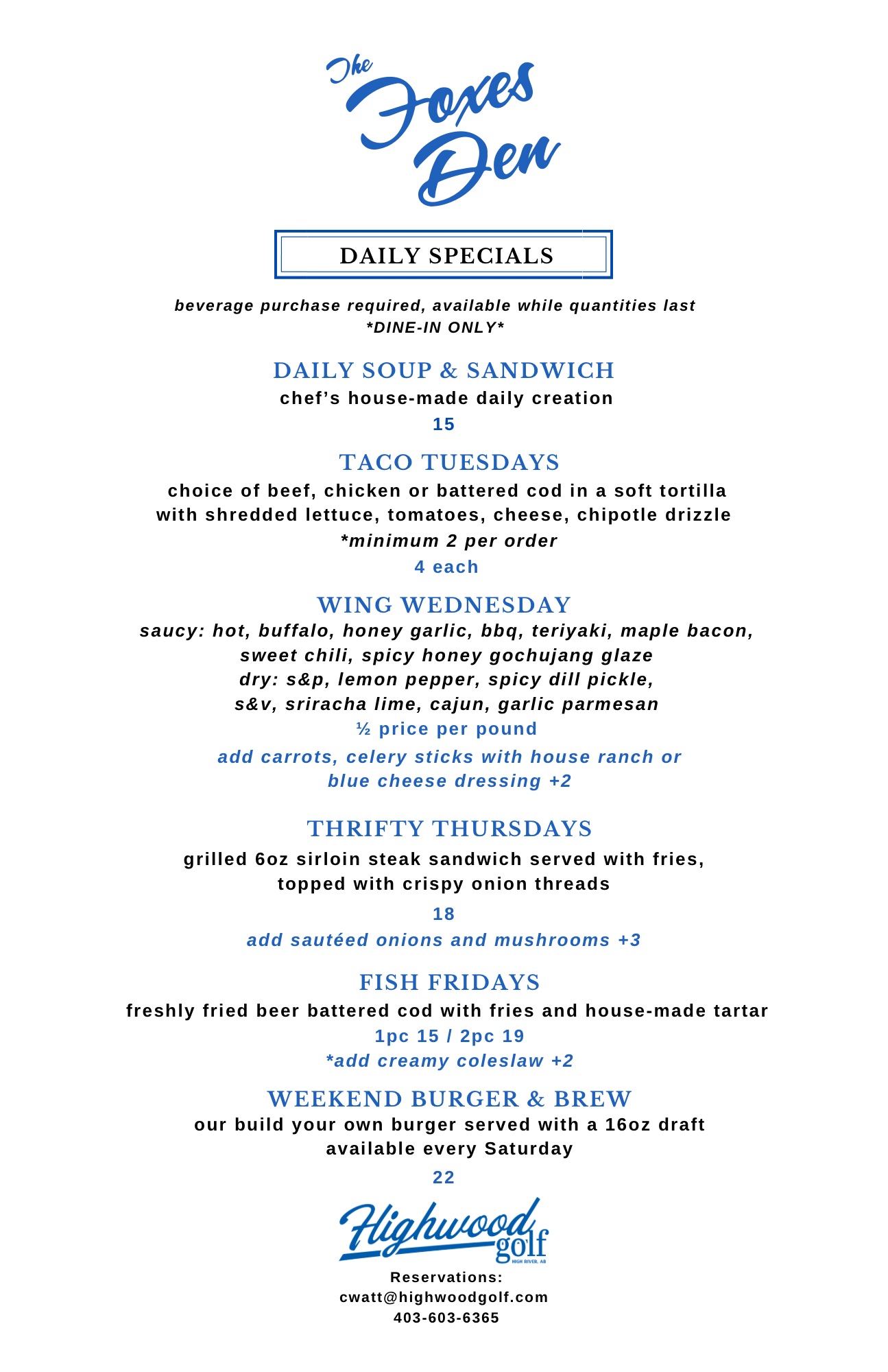 Foxes Den Hours Offseason Hours Tuesday - Saturday 11:00 am - 8 pm Closed Sunday & Monday (403) 603-6365 Menu WINTER CLASSICS DAILY SPECIALS